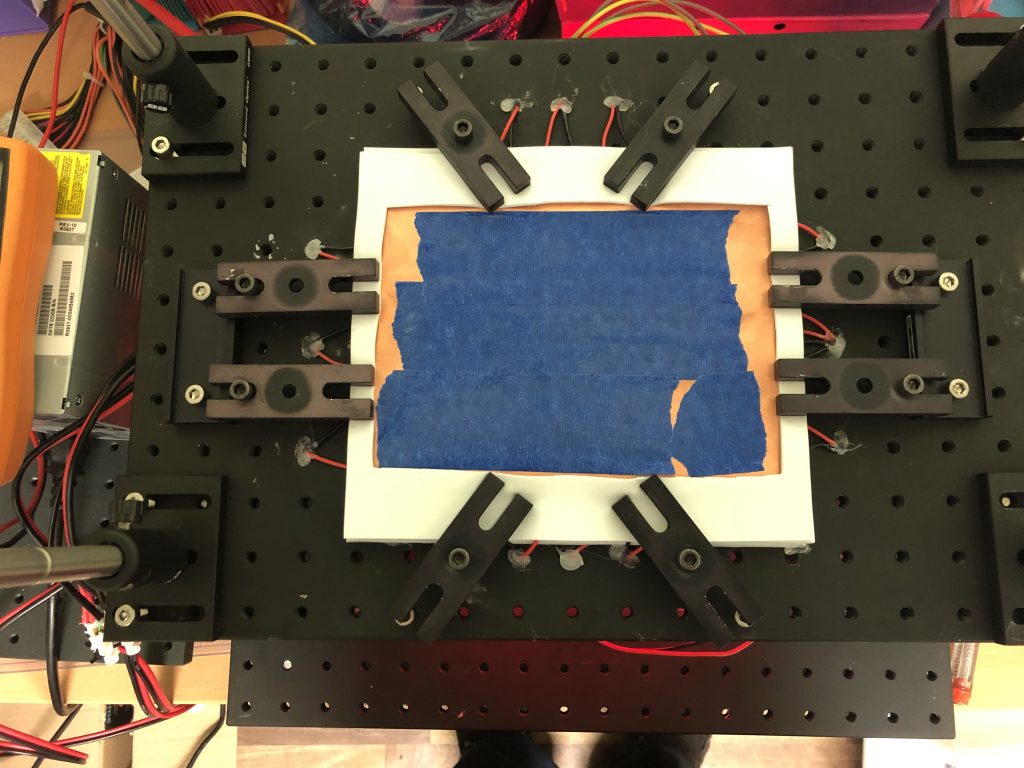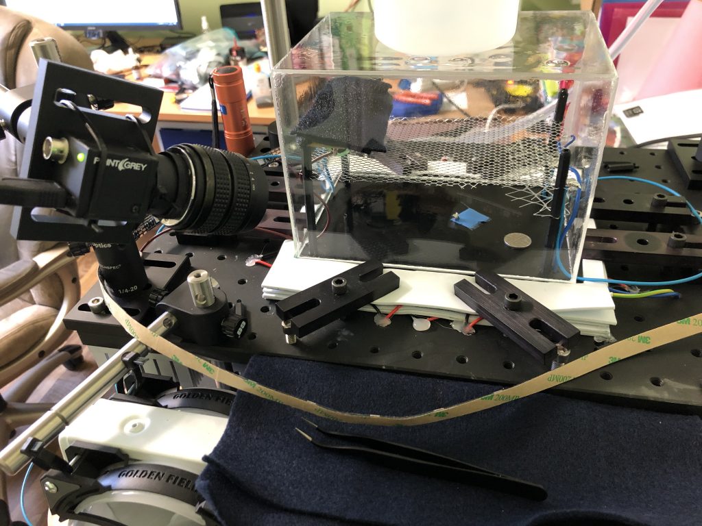 The picture above shows LEDs being used for illumination. I later changed these for lasers with hologram gratings projecting a line. These were then shone just over the top of the cold pate so illuminating and condensation trails.
